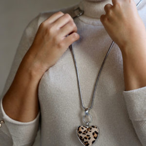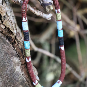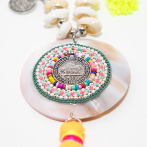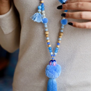 Collier sautoir bohème pompon vert pastel, tête de buffle colorée