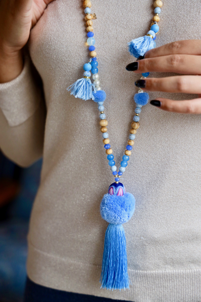Collier sautoir bohème, pompon bleu